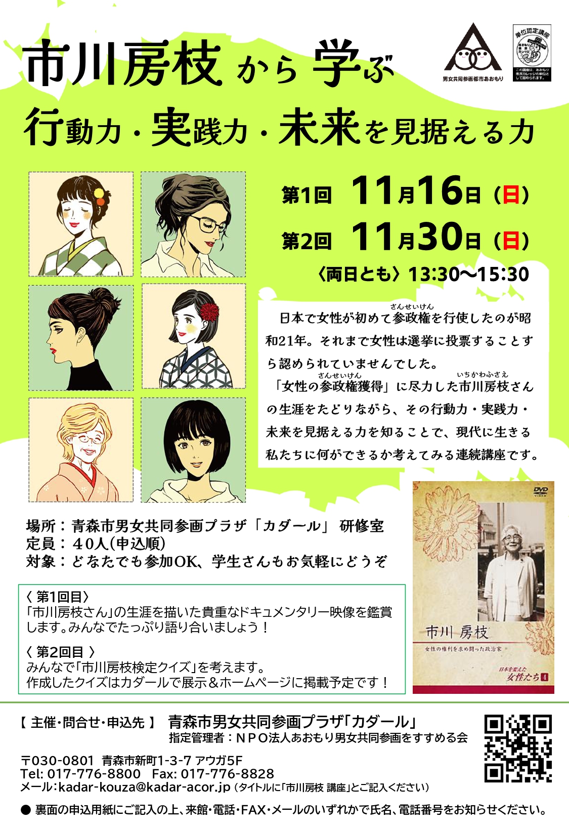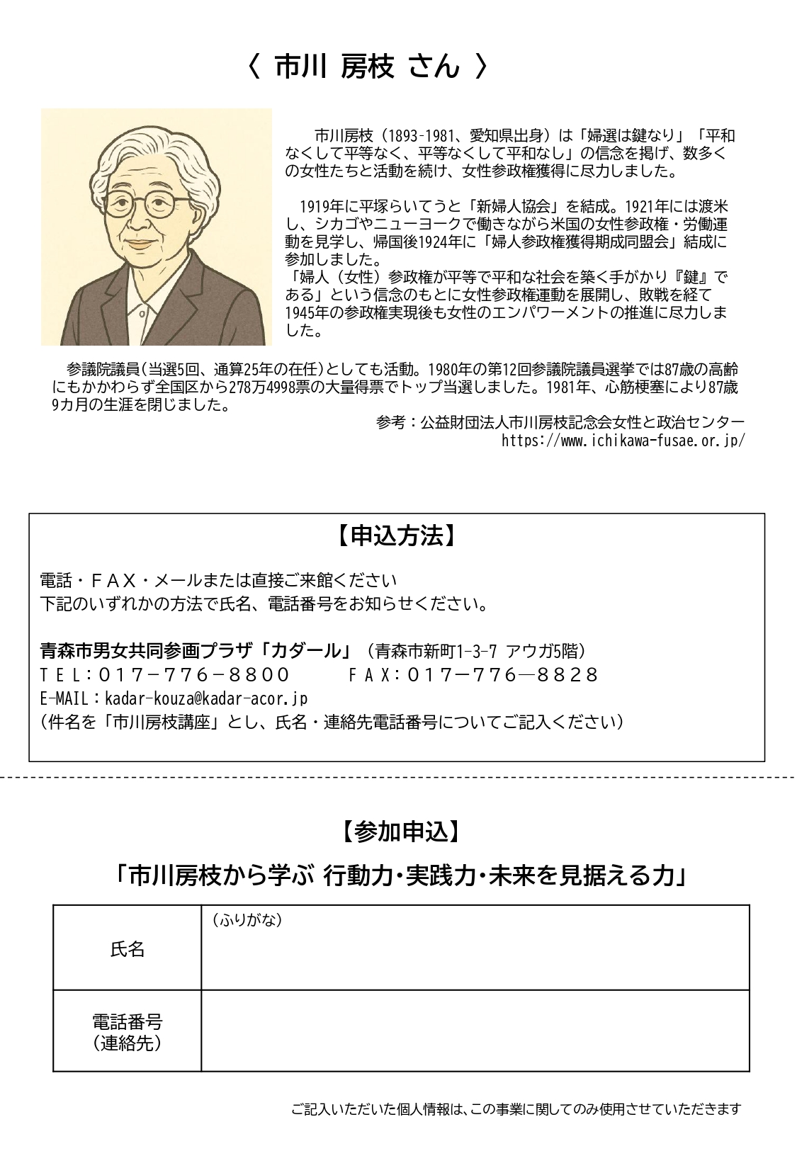 (件名を「市川房枝講座」とし、上記必要事項をお知らせください)