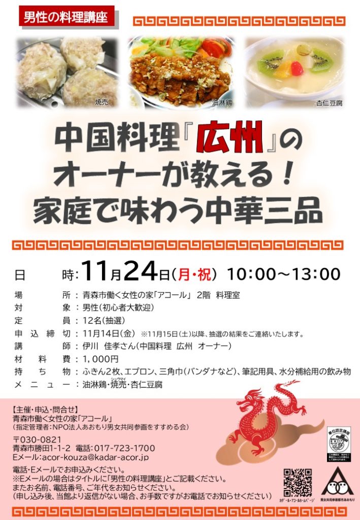 「男性の料理講座「中国料理『広州』のオーナーが教える!家庭で味わう中華三品」を開催します!